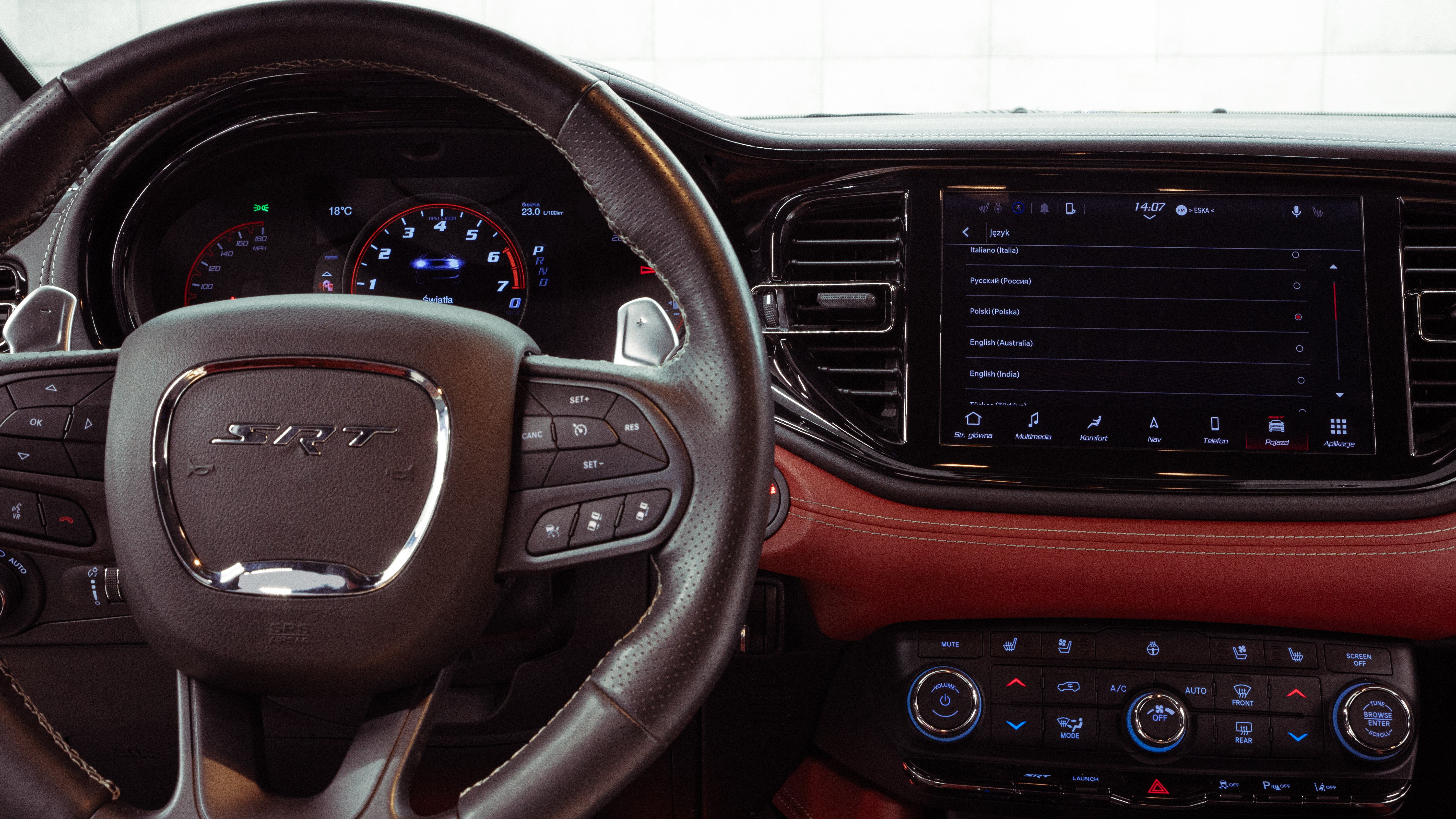 Dodge Durango SRT to potężny SUV, który łączy amerykański charakter z osiągami godnymi sportowego auta. W naszej firmie Fabryczne.pl zadbaliśmy o to, by jego systemy multimedialne i ustawienia były w pełni dostosowane do polskiego użytkownika – od menu, przez lektora, aż po mapy Europy.